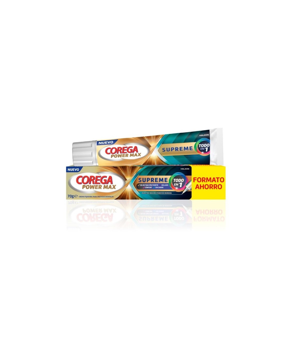 Crema fijadora para prótesis dentales, con tecnología de poder de mordida. Proporciona una fijación fuerte, y un adecuado sellado y comodidad.