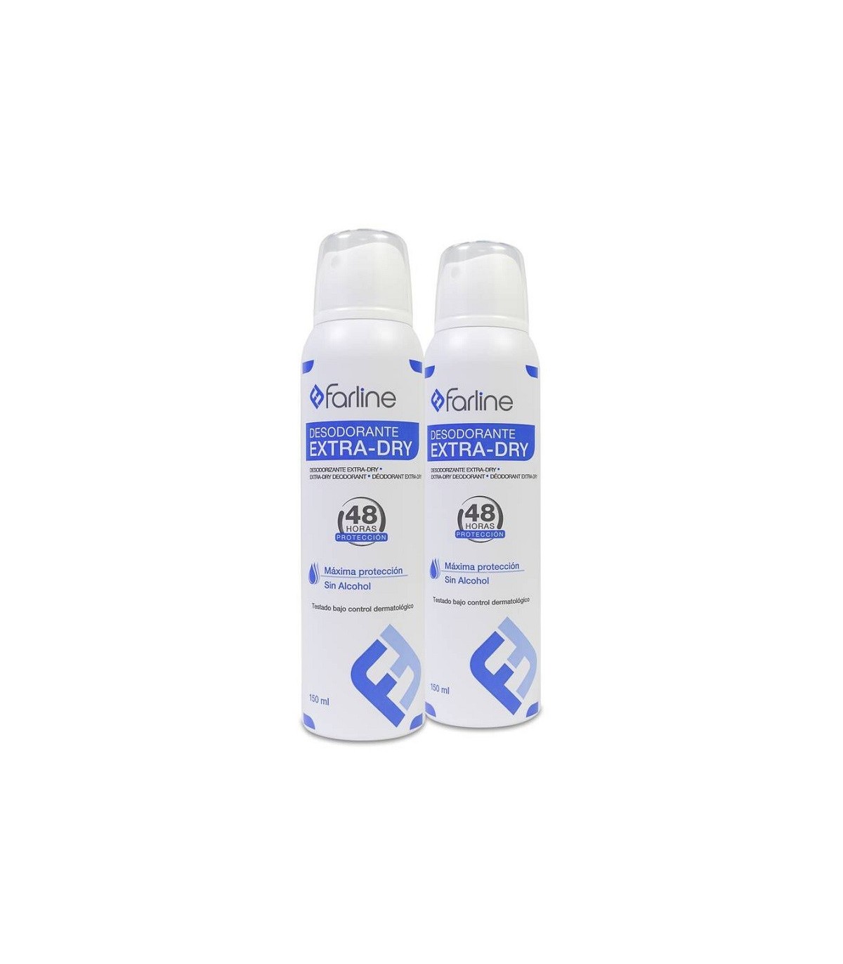 El Duplo Desodorante Extra-Dry 2 x 150 ml de Farline ha sido diseñado para ayudar a controlar la sudoración excesiva, absorbiendo el exceso de humedad y aportando una máxima protección. Este desodorante anti-transpirante proporciona una protección de hasta 48 horas frente a la sudoración y el mal olor. Esta formulado con almidón de arroz y vitamina E lo que cuida la delicada piel de las axilas manteniéndolas suaves, hidratadas y sin irritaciones. En su composición no encontramos la presencia de alcohol. Además, se encuentra testado dermatológicamente. Formato en spray para una mayor comodidad.