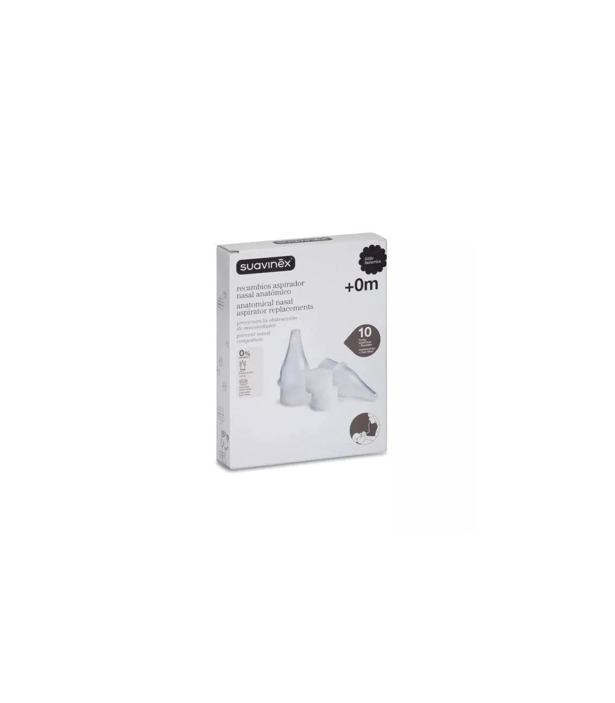Diseñados específicamente para el aspirador nasal anatómico Suavinex. Este instrumento de higiene es indispensable en el cuidado diario de los más pequeños, facilitando la eliminación eficaz de las mucosidades que obstruyen sus delicadas fosas nasales.